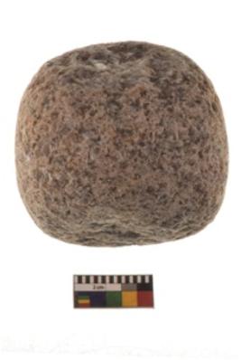 | Description / विवरण | Specimen of a hammer stone roughly rounded in shape with grounded edges and flattish base. |