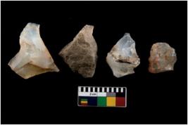 | Description / विवरण | There are n 4 ; worked utilized flakes; there are multidirectional irregular scar pattern on both dorsal and ventral face of the flakes. Three of them are tapering at one end. All are having sharp edges. |