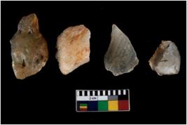 | Description / विवरण | There are n 4 ; worked utilized flakes; there are multidirectional irregular scar pattern on both dorsal and ventral face of the flakes. Two of them are tapering at one end. All are having sharp edges. |