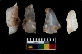 | Description / विवरण | There are n 4 utilized flake cores. There are multi directional irregular scar pattern on them. Three are tapering at one end and one has sharp edge. |