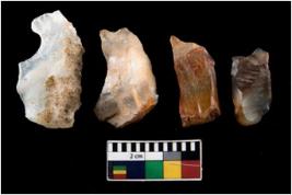 | Description / विवरण | There are n 4 ; worked utilized flakes; there are multidirectional irregular scar pattern on both dorsal and ventral face of the flakes. Three of them are tapering at one end. All are having sharp edges. |