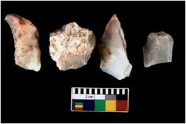 | Description / विवरण | There are n 4 ; worked utilized flakes; there are multidirectional irregular scar pattern on both dorsal and ventral face of the flakes. One of them is tapering at one end with a point. All are having sharp edges. |