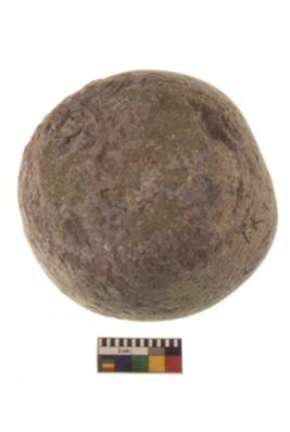 | Description / विवरण | Specimen of a hammer stone roughly rounded in shape with grounded edges and flattish base. |