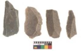| Description / विवरण | There are n 4 utilized flake cores. There are multidirectional irregular dominant scar pattern on both dorsal and ventral face of the flake cores. Two have sharp edges and two are tapering at one end. |