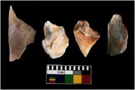 | Description / विवरण | There are n 4 ; worked utilized flakes; there are multidirectional irregular scar pattern on both dorsal and ventral face of the flakes. Two of them are tapering at one end. All are having sharp edges. |