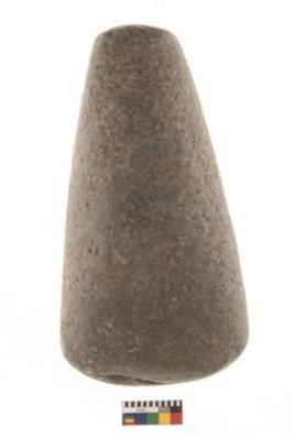 | Description / विवरण | Specimen of triangular shaped Axe with lenticular section and pointed butt. It is under side flat and upper slightly bulging out. |