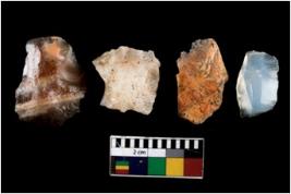 | Description / विवरण | There are n 4 ; worked utilized flakes; there are multidirectional irregular scar pattern on both dorsal and ventral face of the flakes. One of them is tapering at one end. All are having sharp edges. |