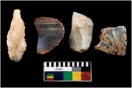 | Description / विवरण | There are n 4 ; worked utilized flakes; there are multidirectional irregular scar pattern on both dorsal and ventral face of the flakes. Two of them are tapering at one end. All are having sharp edges. |