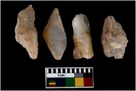 | Description / विवरण | There are n 4 utilized flake cores. There are multi directional irregular scar pattern on them. Two are tapering at one end and two have sharp edges. |