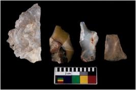 | Description / विवरण | There are n 4 ; worked utilized flakes; there are multidirectional irregular scar pattern on both dorsal and ventral face of the flakes. All of them are tapering at one end. All are having sharp edges. |
