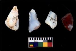 | Description / विवरण | There are n 4 cores; there are multi directional irregular scar pattern on them. Some of them are tapering at one end. 3 quartz 1 chalcedony |