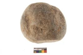 | Description / विवरण | Specimen of a spherical shaped hammer stone with battered surface. |