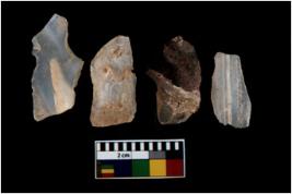 | Description / विवरण | There are n 4 utilized flake cores. Out of them one is made up of Chert and three are made up of Chalcedony. There are multi directional irregular scar pattern on them. All of them are tapering at one end. |