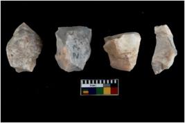 | Description / विवरण | Specimen of flake tools with prominent flaking marks. They are made up of a short flakes with sides trimmed. |