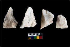 | Description / विवरण | There are n 4 utilized flake cores. There are multidirectional irregular scar pattern on both dorsal and ventral face of the flake cores. One has sharp edges and three have blunted edges. |