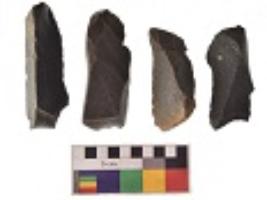 | Description / विवरण | There are n 4 utilized flakes. There are multi directional irregular scar pattern on both dorsal and ventral face of the flakes. Three are tapering at one end and one has sharp edge. |