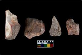 | Description / विवरण | There are n 4 utilized flake cores. There are multidirectional irregular scar pattern on both dorsal and ventral face of the flake cores. One has sharp edges and three have blunted edges. |