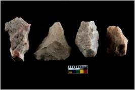 | Description / विवरण | There are n 4 utilized flake cores. There are multidirectional irregular scar pattern on both dorsal and ventral face of the flake cores. One has sharp edges and three have blunted edges. |