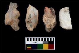 | Description / विवरण | There are n 4 utilized flake cores. There are multi directional irregular scar pattern on them. All of them are tapering at one end. |