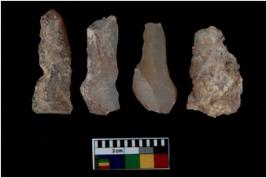 | Description / विवरण | There are n 4 utilized flake cores. There are multi directional irregular scar pattern on them. All of them are tapering at one end. |