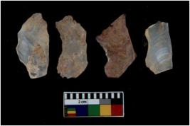 | Description / विवरण | There are n 4 utilized flake cores. There are multi directional irregular scar pattern on them. All of them are tapering at one end. |