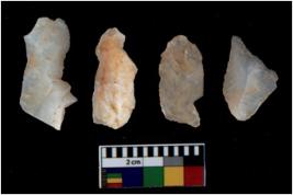| Description / विवरण | There are n 4 utilized flake cores. There are multi directional irregular scar pattern on them. All of them are tapering at one end. |