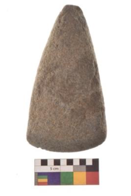 | Description / विवरण | Specimen of triangular shaped Axe with lenticular section and pointed butt. It is under side flat and sharpe edge. |