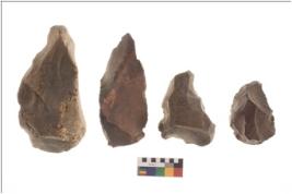 | Description / विवरण | Specimen of flake tools with prominent flaking marks. They are made up of a short flakes with sides trimmed. |