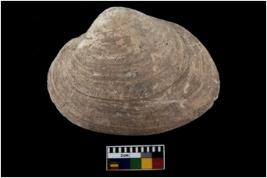| Description / विवरण | Specimen of a large bivalve marine shell with ground edge. Probably use as spoon. |