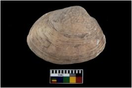 | Description / विवरण | Specimen of a large bivalve marine shell with ground edge. Probably use as spoon. |