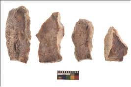 | Description / विवरण | Specimen of flake tools with prominent flaking marks. They are made up of a short flakes with sides trimmed. |