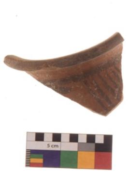 | Description / विवरण | Specimen of Potsherd black on red painted pottery. It is fine fabric in sharp contrast with painted design are executed in black pigment. |
