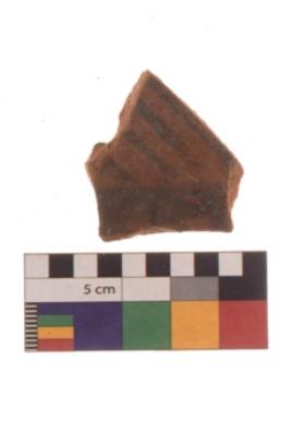 | Description / विवरण | Specimen of Potsherd black on red painted pottery. It is fine fabric in sharp contrast with painted design are executed in black pigment. |