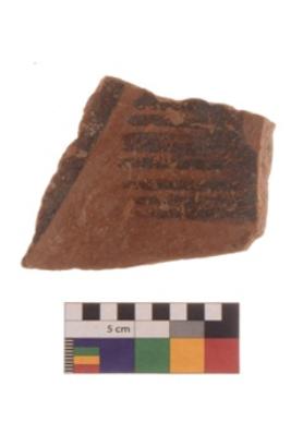 | Description / विवरण | Specimen of Potsherd black on red painted pottery. It is fine fabric in sharp contrast with painted design are executed in black pigment. |