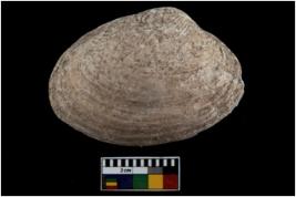 | Description / विवरण | Specimen of a large bivalve marine shell with ground edge. Probably use as spoon. |