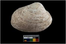 | Description / विवरण | Specimen of a large bivalve marine shell with ground edge. Probably use as spoon. |