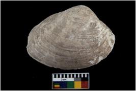 | Description / विवरण | Specimen of a large bivalve marine shell with ground edge. Probably use as spoon. |