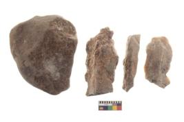 | Description / विवरण | There are n 4 utilized flakes. There are multi directional irregular scar pattern on both dorsal and ventral face of the flakes. three are tapering at one end and one has blunted edge. |