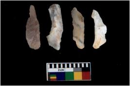| Description / विवरण | There are n 4 utilized flake cores. There are multi directional irregular scar pattern on them. All of them are tapering at one end. |