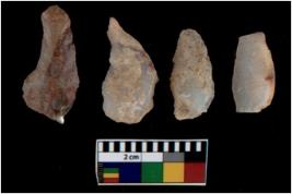 | Description / विवरण | There are n 4 utilized flake cores. There are multi directional irregular scar pattern on them. All of them are tapering at one end. |