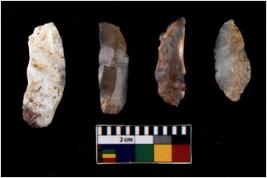 | Description / विवरण | There are n 4 flakes tool; there are flakes with sides trimmed, Marks of secondary flaking are present on the both the faces. The dorsal is relatively flat. |