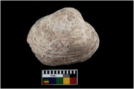 | Description / विवरण | Specimen of a large bivalve marine shell with ground edge. Probably use as spoon. |