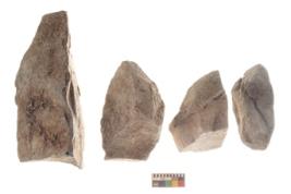 | Description / विवरण | There are n 4 utilized flakes. There are multi directional irregular scar pattern on both dorsal and ventral face of the flakes. two are tapering at one end and two have blunted edges. |