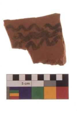 | Description / विवरण | Specimen of a potsherd. It is reddish in colour with black decorative nature painting on it. wavy thick line |