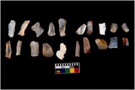 | Description / विवरण | Specimen of flakes tool with prominent flaking marks. It made up of a short flakes with sides trimmed. |