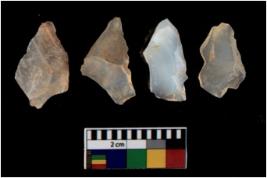 | Description / विवरण | There are n 4 utilized flake cores. There are multi directional irregular scar pattern on them. All of them are tapering at one end. |