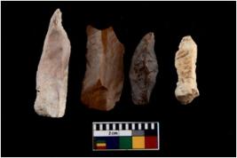 | Description / विवरण | There are n 4 Flake tool; There are multidirectional irregular scar pattern on them. few have blunt edges, Some of them are tapering at one end. |
