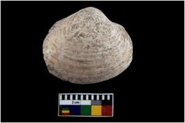 | Description / विवरण | Specimen of a large bivalve marine shell with ground edge. Probably use as spoon. |