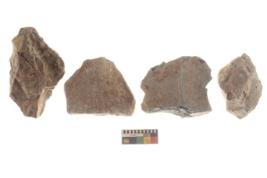 | Description / विवरण | There are n 4 utilized flakes. There are multi directional irregular scar pattern on both dorsal and ventral face of the flakes. three are tapering at one end and one has sharp edge. |