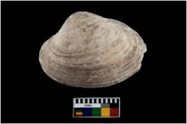 | Description / विवरण | Specimen of a large bivalve marine shell with ground edge. Probably use as spoon. |